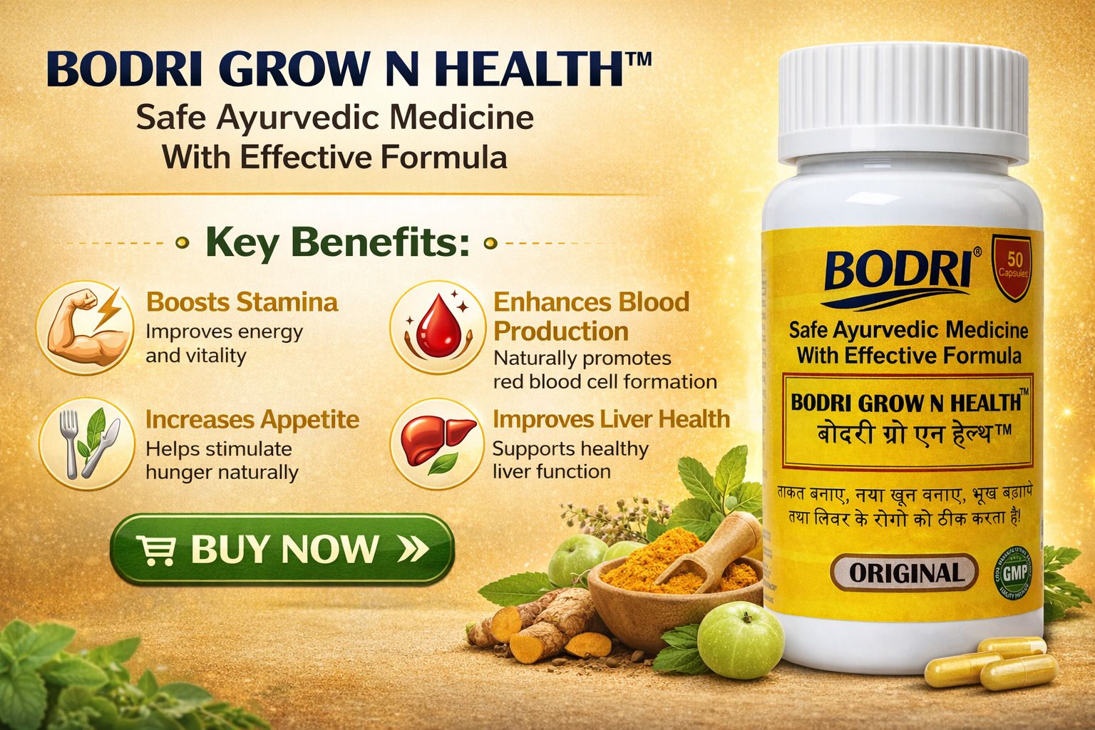 This Capsules is a powerful Ayurvedic proprietary formulation enriched with the goodness of natural ingredients.This Capsule supports overall family health by boosting immunity, improving digestion, increasing energy levels, and helping reduce tiredness caused by daily stress.This helps maintain wellness, supports metabolic functions, and promotes vitality throughout the day.